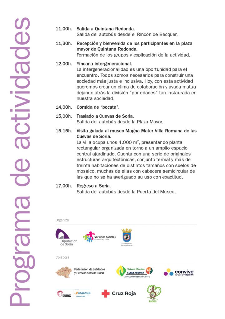 Bajo el título “Viaje Intergeneracional Por Las Tradiciones Del Valle”, el próximo jueves 27 de abril la Diputación Provincial de Soria junto a 6 Entidades de Carácter Social (ASPACE, ASOVICA, CEPAIN, Federación de Asociaciones de Jubilados y Pensionistas, Cruz Roja y FADISO) que forman parte del proyecto Semillero Intergeneracional conmemora el día Europeo de la solidaridad y la cooperación entre generaciones que se celebra el 29 de Abril.